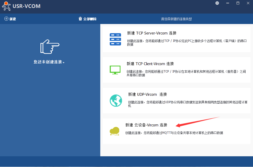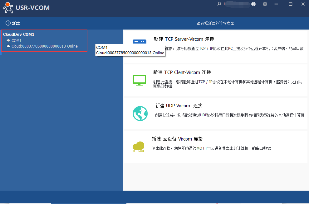 14、打開VCOM虛擬串口軟件,點(diǎn)擊新建云設(shè)備-Vircom連接
