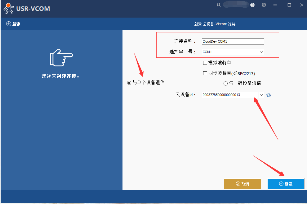 16、選擇com口,不要和電腦上已存在的com口沖突,選擇與單個(gè)設(shè)備通信,云設(shè)備ID選擇在云端添加的其中一個(gè)N540的設(shè)備編號(hào),點(diǎn)擊新建,生成串口