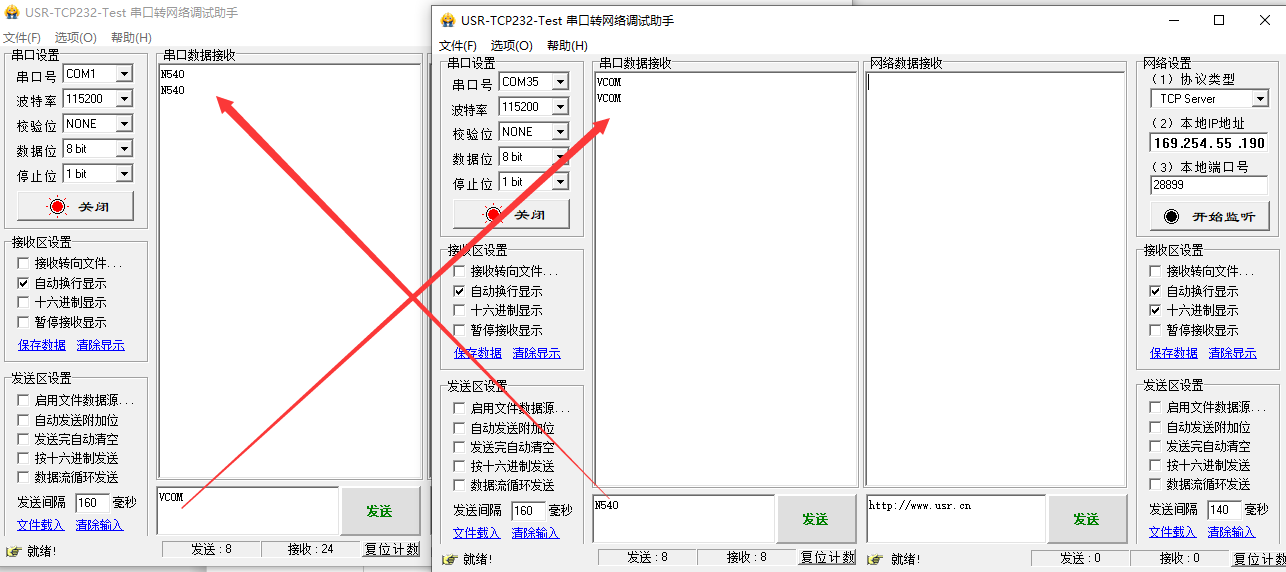 17、用串口調(diào)試助手打開N540的串口和VCOM生成的串口,進(jìn)行數(shù)據(jù)收發(fā)測(cè)試