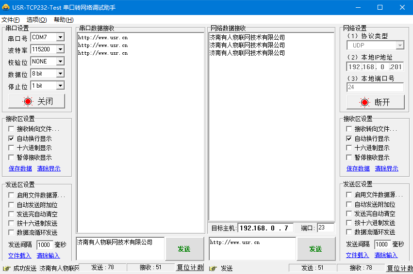 N540 RS485串口做UDP server,電腦下載的串口網(wǎng)絡(luò)助手,左側(cè)用COM口打開,串口參數(shù)和RS485串口參數(shù)保持一致,波特率、數(shù)據(jù)位、停止位、校驗位。右側(cè)用UDP打開,本地IP填電腦的IP,本地端口填電腦的端口24。目標(biāo)主機填N540的IP,端口填23。
