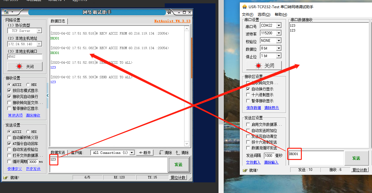 5、打開串口調(diào)試助手,填寫串口參數(shù)和DR301的串口參數(shù)并保持一致,打開串口,即可和服務器建立通信。