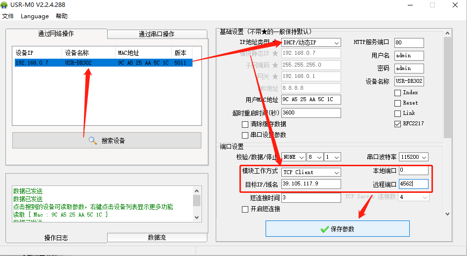 5、打開串口》調(diào)試助手,串口參數(shù)和DR302的串口參數(shù)保持一致,打開串口,即可和服務(wù)器建立通信。