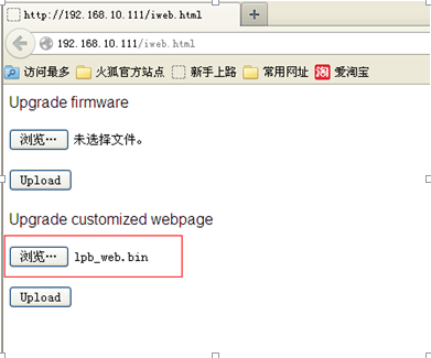 1.登陸模塊升級專用界面,AP模式下是10.10.100.254/iweb.html,STA模式下是路由器分配的地址+/iweb.html,即在地址后面增加/iweb.html。