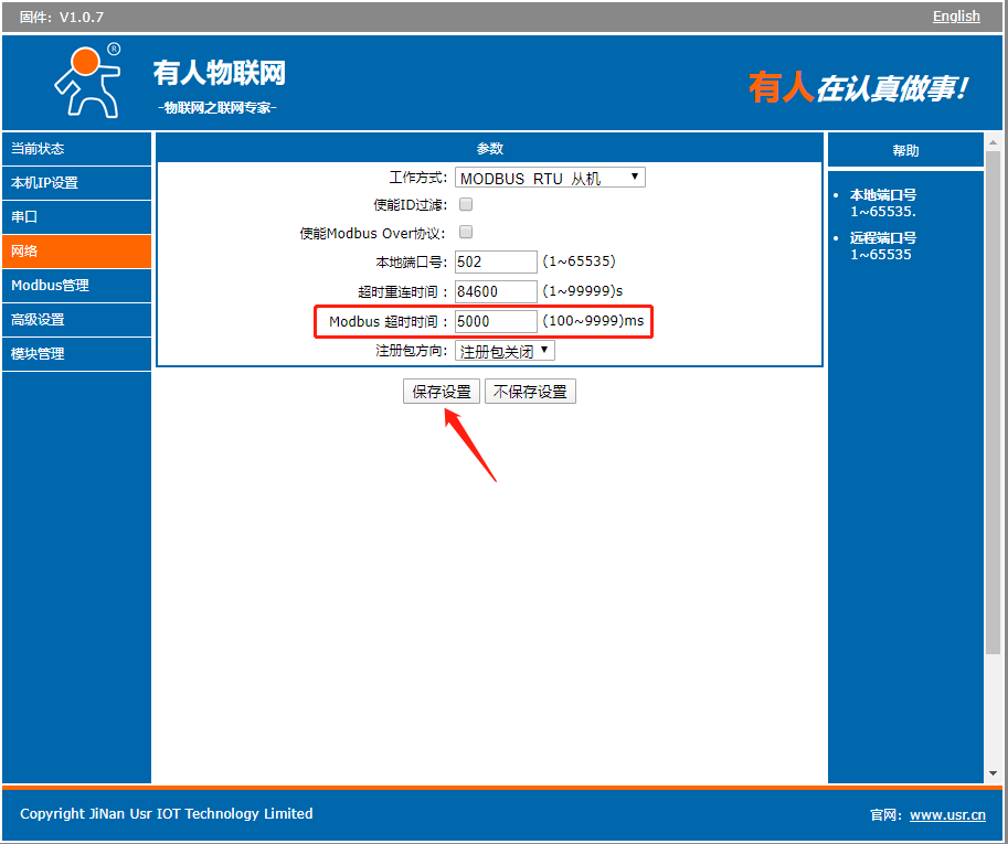 6、網(wǎng)絡里面的MODBUS 超時時間設置大一點,可以設置成5000。點擊保存設置。