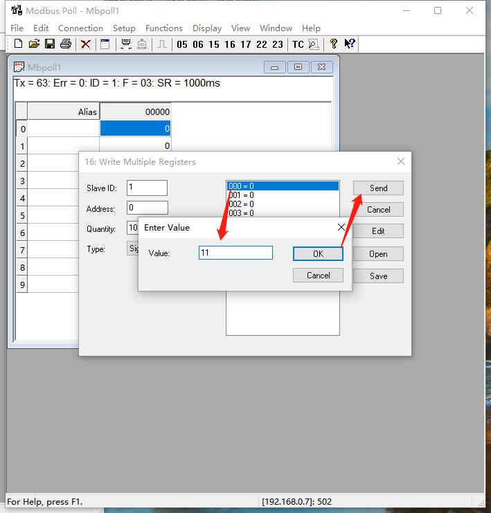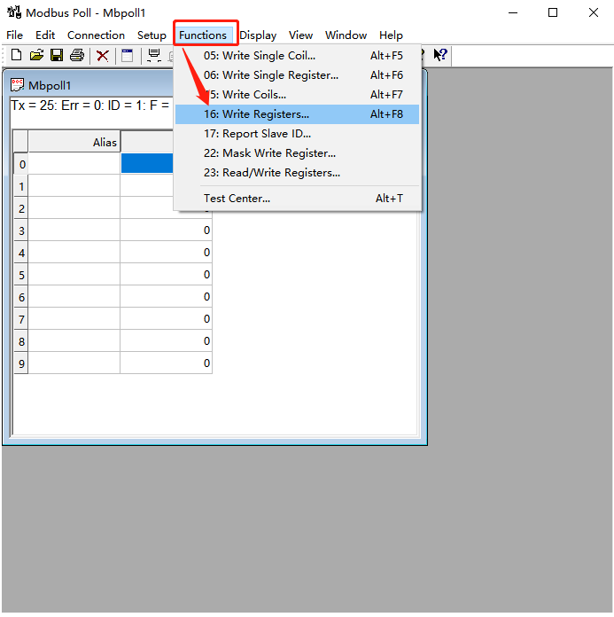 11、modbuspoll軟件點擊Funtions,選擇16:Write Registers