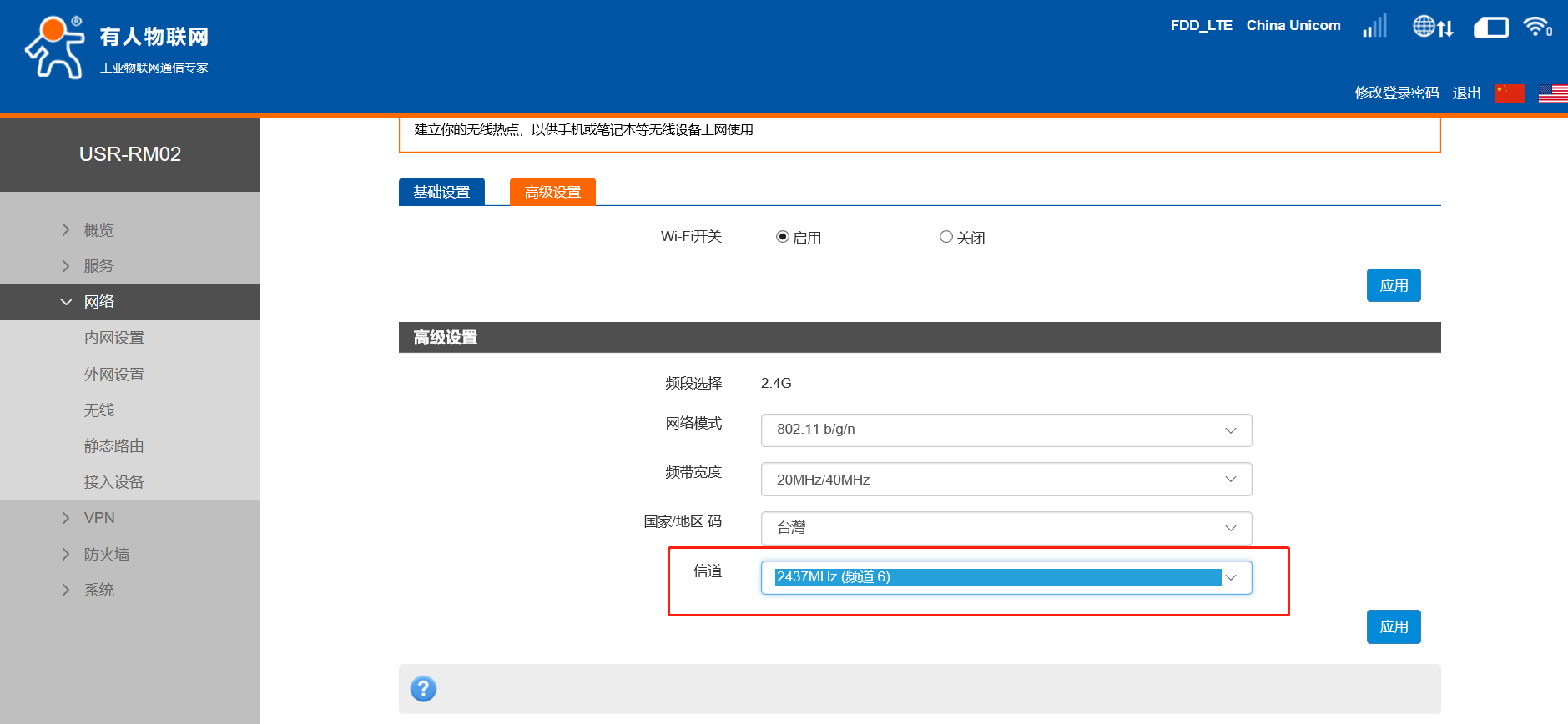 2、如果WiFi信號(hào)不好,天線也都接對了,可以修改一個(gè)當(dāng)?shù)乇容^干凈的信道,之后點(diǎn)擊應(yīng)用。