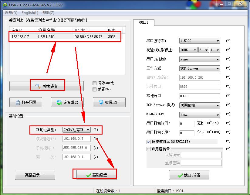 用M4設(shè)置軟件搜索USR-N510的Ip,192.168.0.7,USR-N510用串口設(shè)置軟件設(shè)置DHCp,動(dòng)態(tài)獲取Ip。