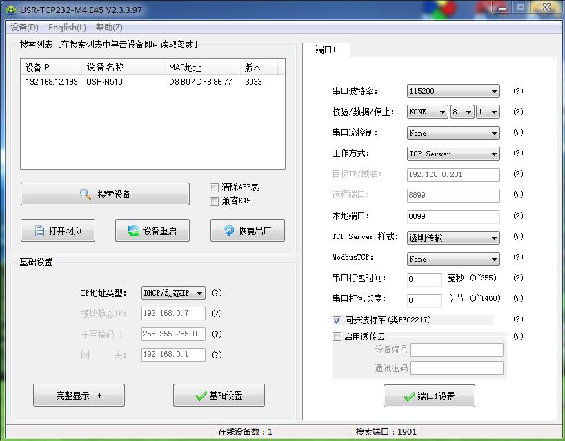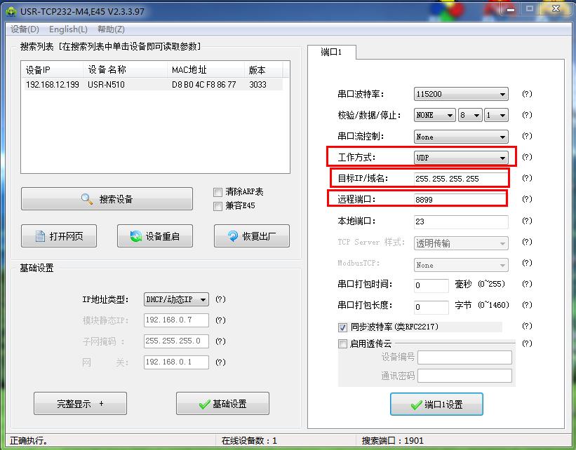 N510網(wǎng)口用網(wǎng)線接路由器,電腦也連接同一個(gè)路由器。用M4設(shè)置軟件搜索USR-N510的Ip 192.168.12.199