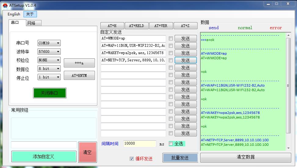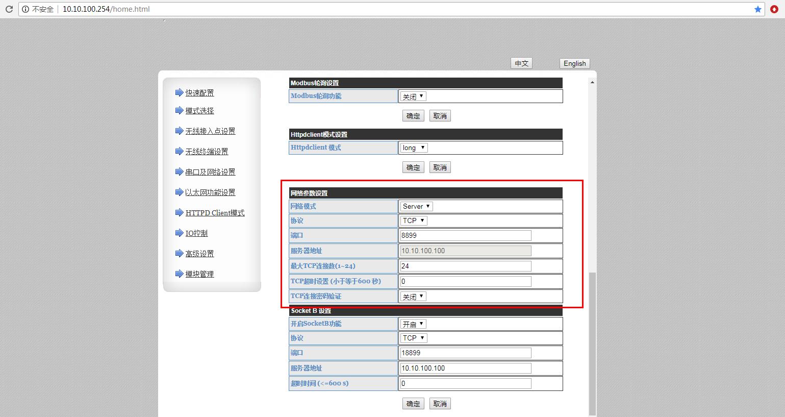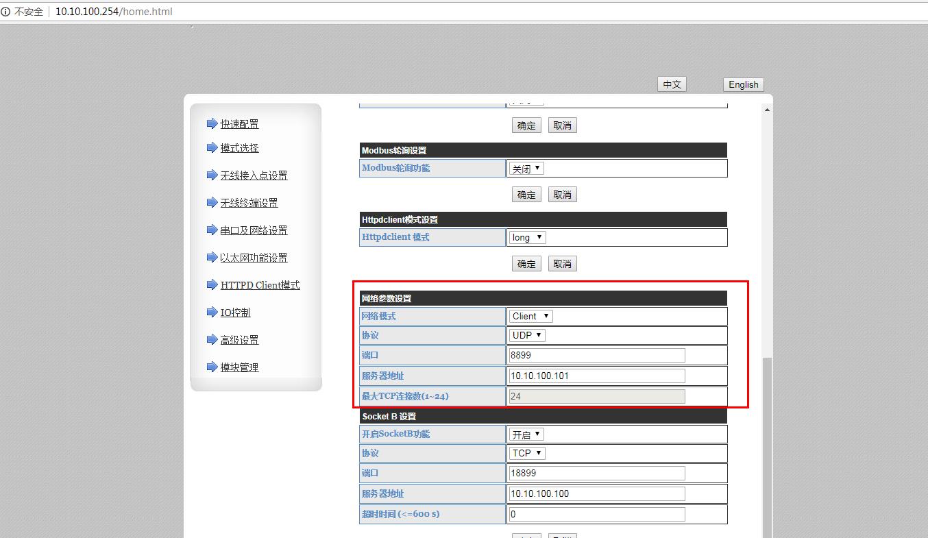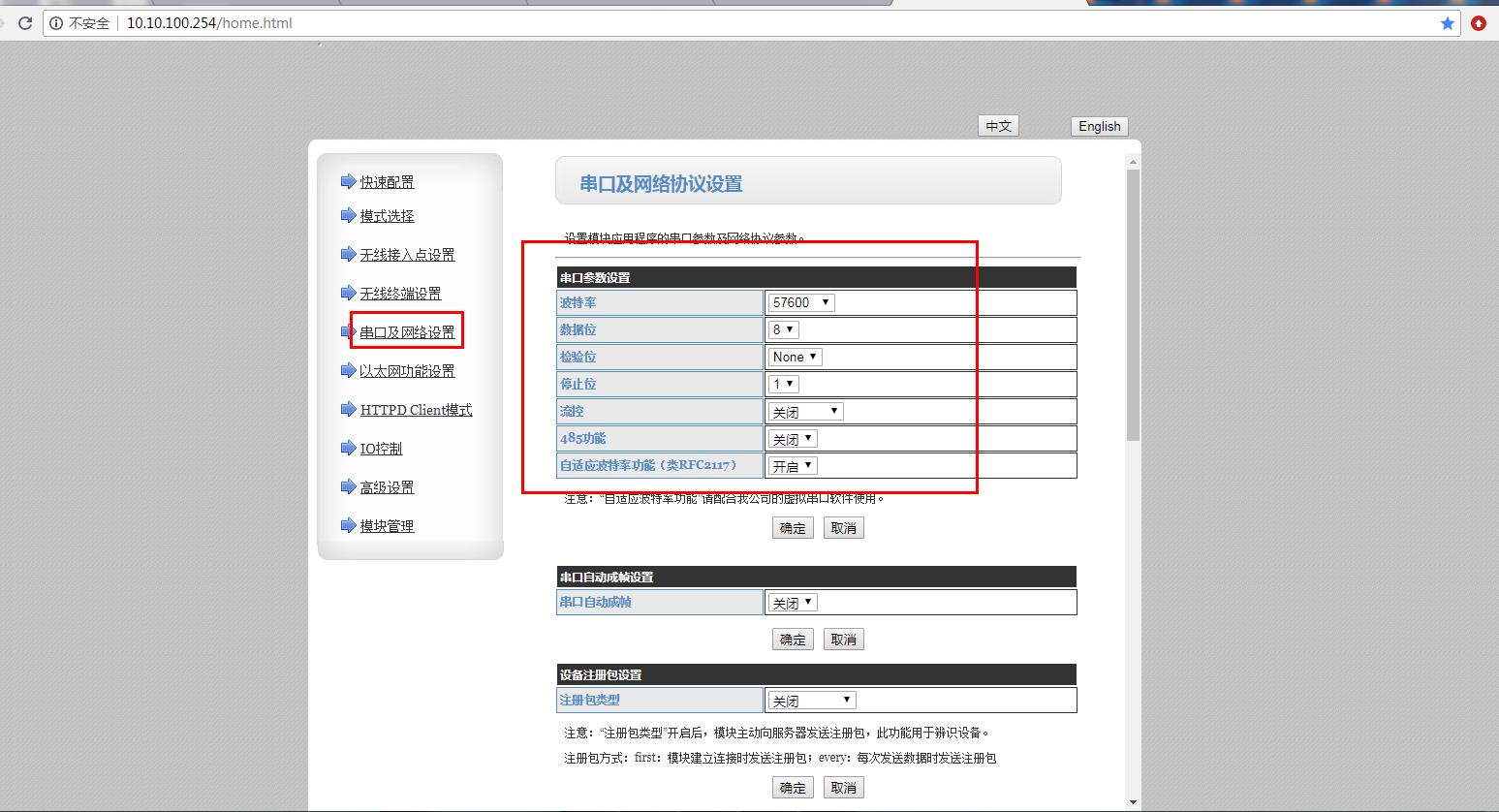 用USR-WIFI232-B2的Ip 10.10.100.254 登錄USR-WIFI232-B2的網(wǎng)頁(yè),然后修改W610的串口參數(shù)。測(cè)試4種工作模式下,串口和網(wǎng)絡(luò)的數(shù)據(jù)透?jìng)鳌?/p>