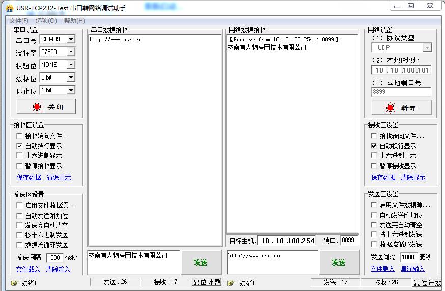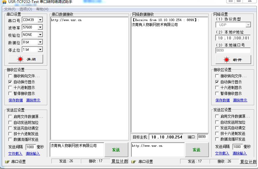 在電腦下載,并安裝打開USR-TCp232-TEST 串口網(wǎng)絡(luò)助手。建立UDp連接,就可以實(shí)現(xiàn)N510串口和網(wǎng)絡(luò)之間數(shù)據(jù)傳輸。