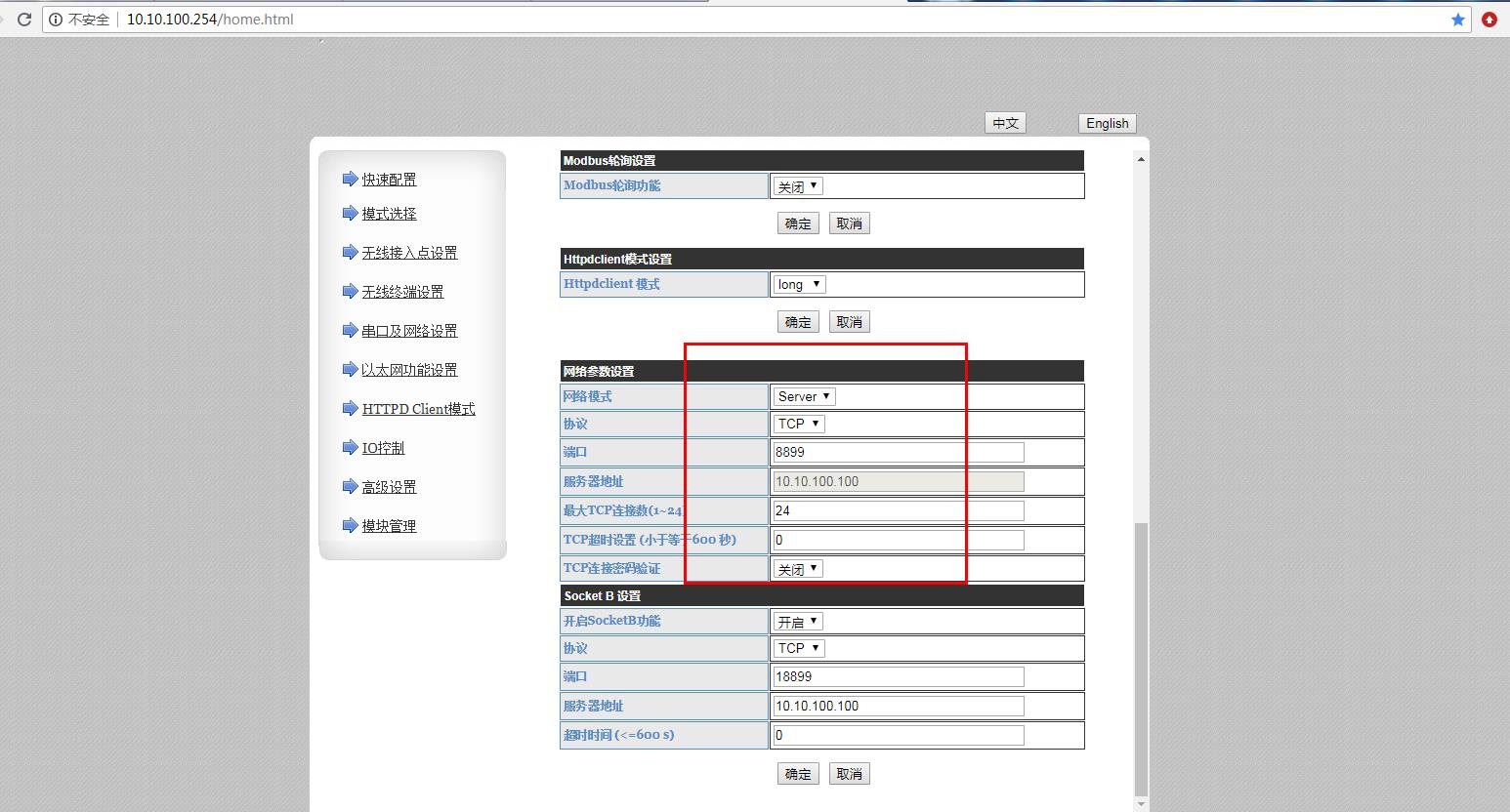 B2模塊在網(wǎng)頁(yè)上,串口及網(wǎng)絡(luò)設(shè)置,設(shè)置網(wǎng)絡(luò)模式TCp server,端口填8899。保存參數(shù),重啟B2模塊