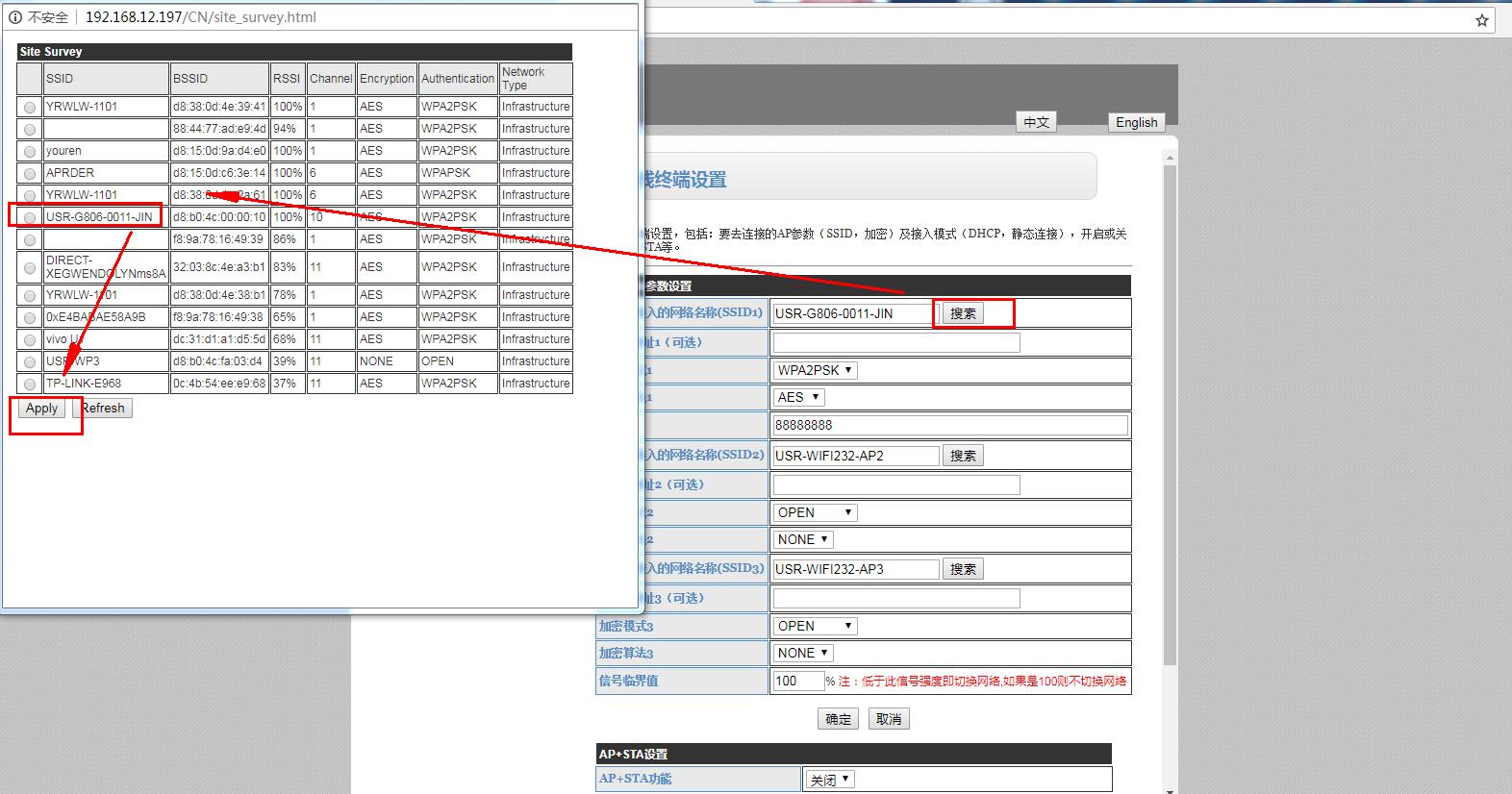 在無(wú)線終端設(shè)置中,點(diǎn)擊模塊要接入的網(wǎng)絡(luò)名稱SSID,可以手動(dòng)輸入B2模塊設(shè)置STA模式要連接路由器wifi的名稱,或者點(diǎn)擊后面的搜索,搜索路由器的wifi,勾選,并點(diǎn)擊AppLY應(yīng)用。