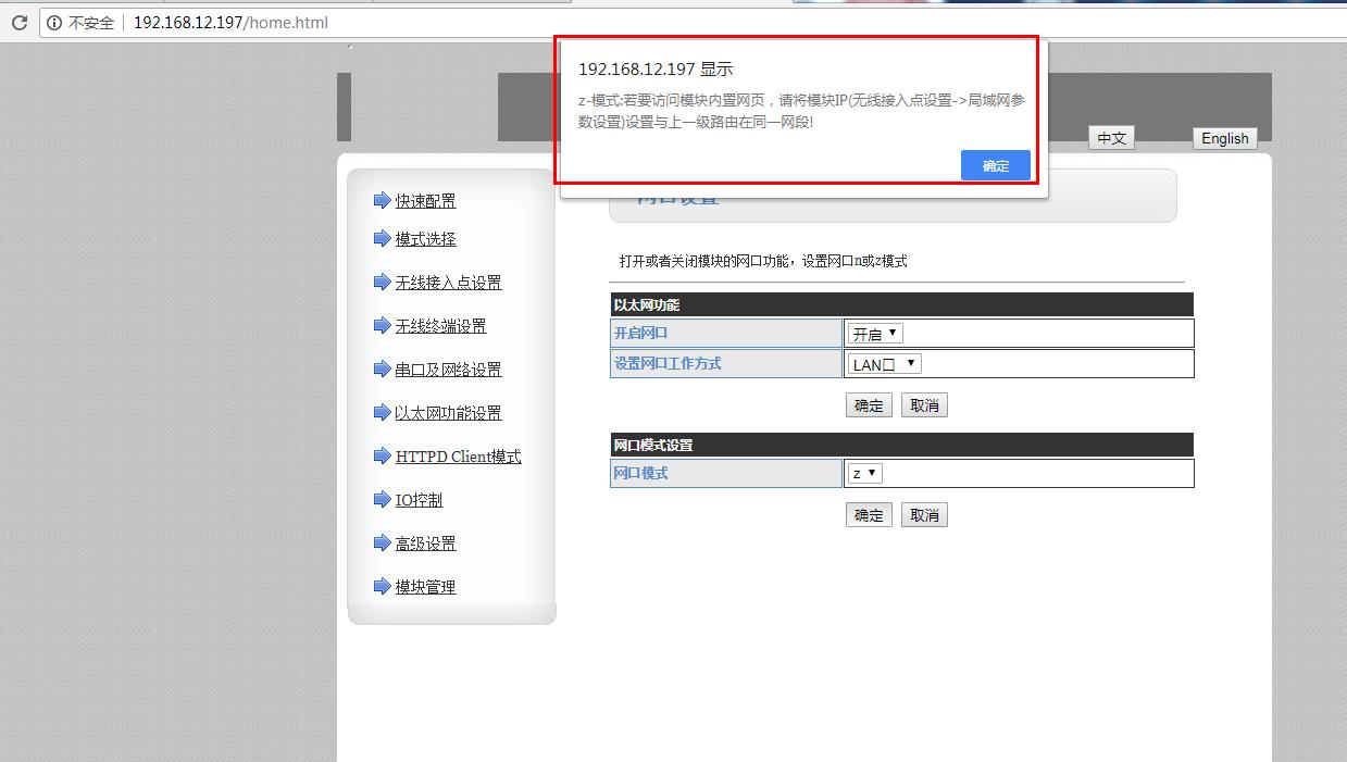 會(huì)跳出提示對(duì)話框,z-模式:若要訪問(wèn)模塊內(nèi)置網(wǎng)頁(yè),請(qǐng)將模塊Ip(無(wú)線接入點(diǎn)設(shè)置——》局域網(wǎng)參數(shù)設(shè)置)設(shè)置與上一級(jí)路由器再同一網(wǎng)段!