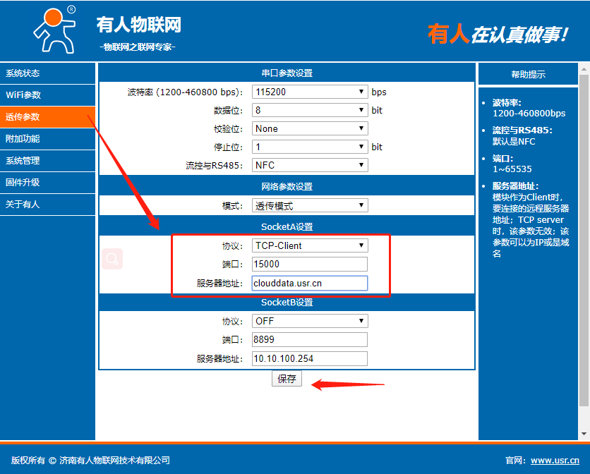 13、進(jìn)入到“透?jìng)鲄?shù)”,串口參數(shù)設(shè)置為和您終端設(shè)備的串口參數(shù)一致。網(wǎng)絡(luò)設(shè)置上設(shè)置為Tcp Client,透?jìng)髟频挠蛎麨閏louddata.usr.cn,透?jìng)髟频亩丝跒?5000,設(shè)置完點(diǎn)擊保存。