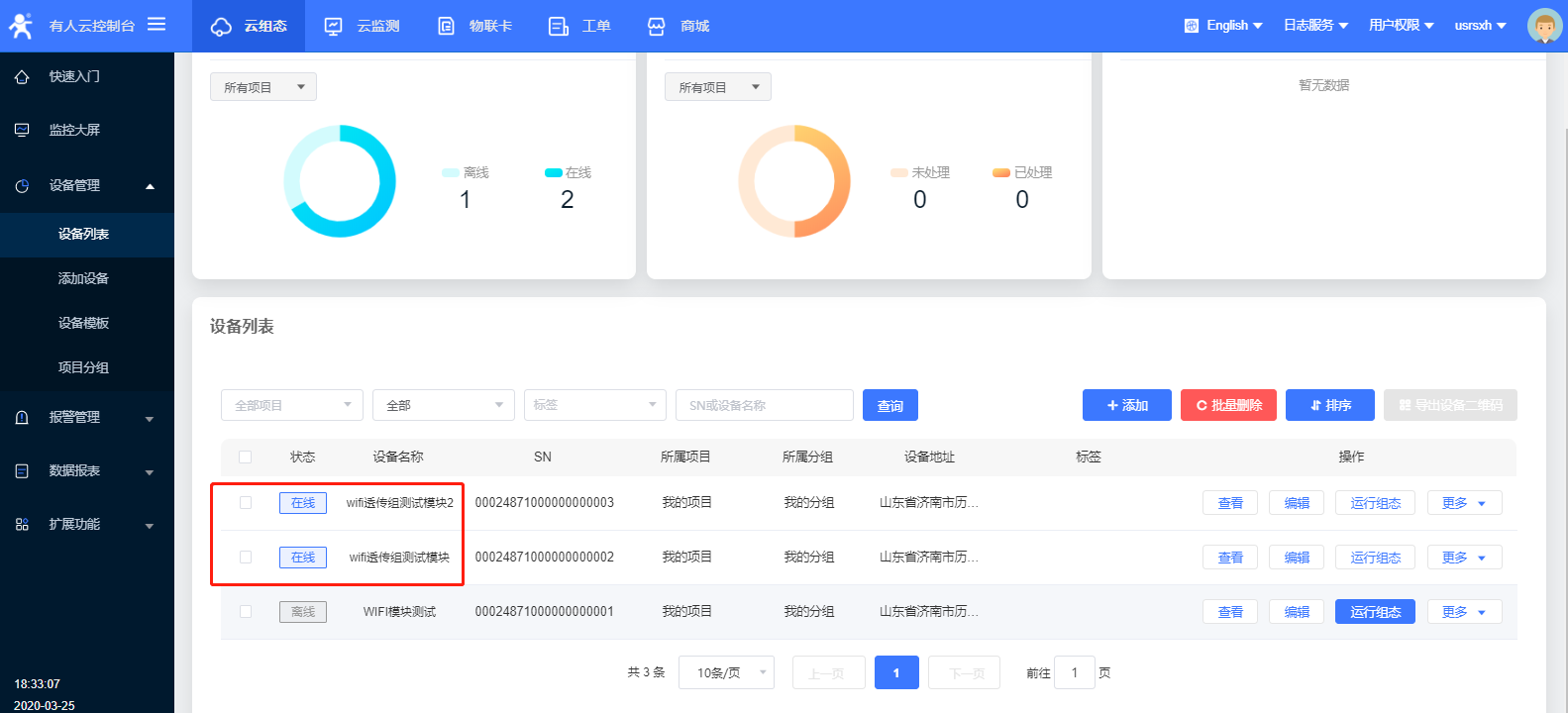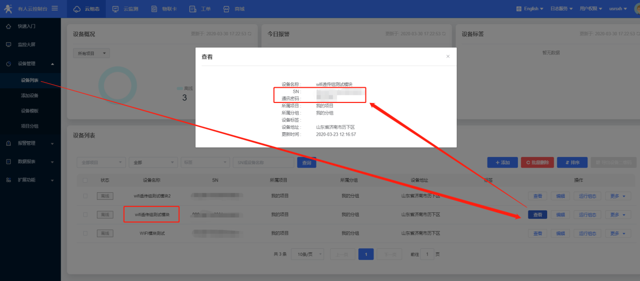 16、依據(jù)第11~15步,讓第二個(gè)wifi模塊入網(wǎng),第二個(gè)模塊的設(shè)備ID與通訊密碼填寫位透?jìng)髟颇K2的SN與密碼,配置完模塊重啟, 第二個(gè)模塊在云端顯示上線。