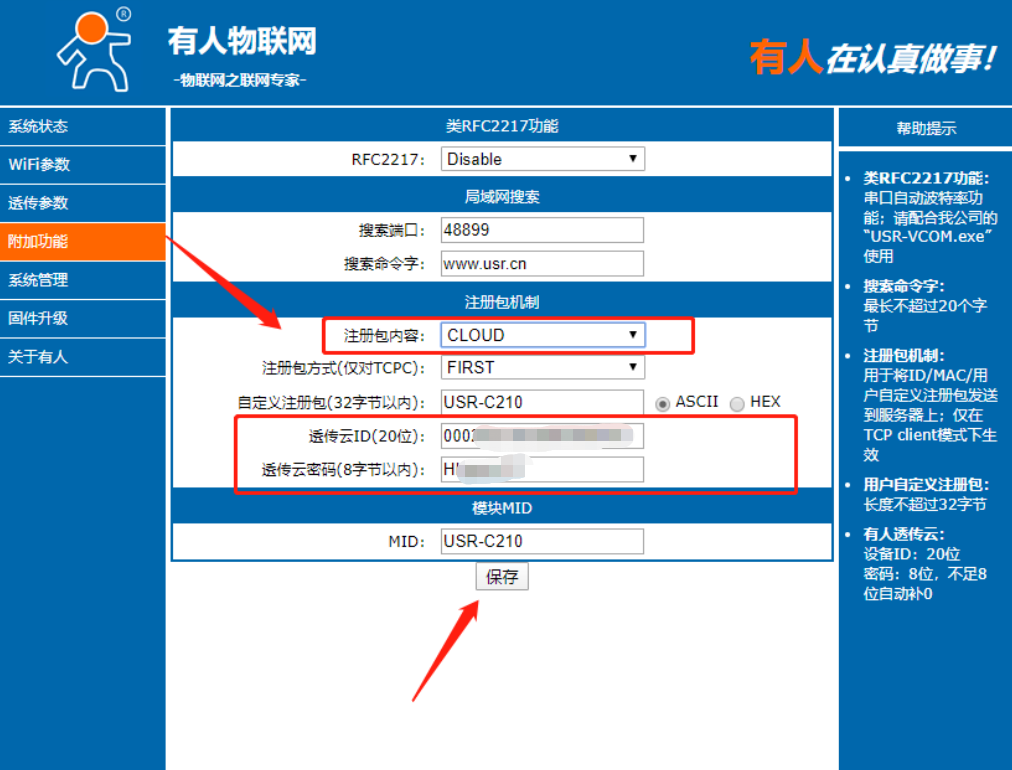 14、進(jìn)入附加功能,注冊(cè)包選擇透?jìng)髟?,填上透?jìng)髟粕闲陆⒌脑O(shè)備id,和密碼(如下圖所示),點(diǎn)擊保存。