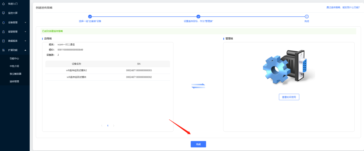 9、再次添加設(shè)備,名稱設(shè)置“wifi透?jìng)鹘M測(cè)試模塊2”,設(shè)備ID與通信密碼自動(dòng)生成后點(diǎn)擊“下一步”后,選擇“數(shù)據(jù)透?jìng)鳌?,確認(rèn)添加。