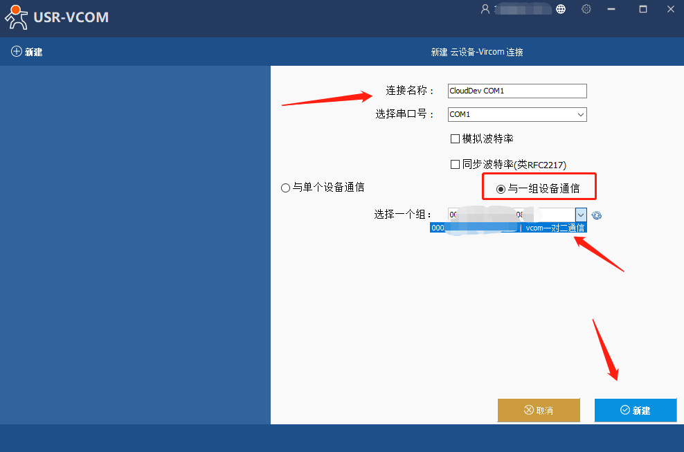 24、自定義連接名稱,選擇要虛擬的串口,點(diǎn)擊“與一組設(shè)備通信”,選擇在云端生成透?jìng)鹘M,點(diǎn)擊新建。