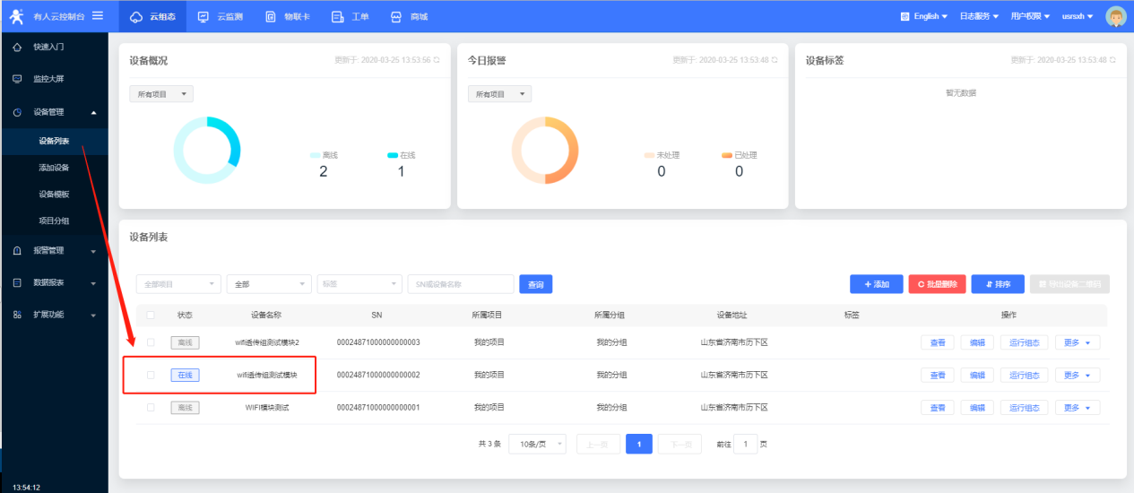 15、設(shè)置完所有的參數(shù)要重啟設(shè)備,稍等一會(huì),在有人云界面,您會(huì)看到設(shè)備已經(jīng)上線