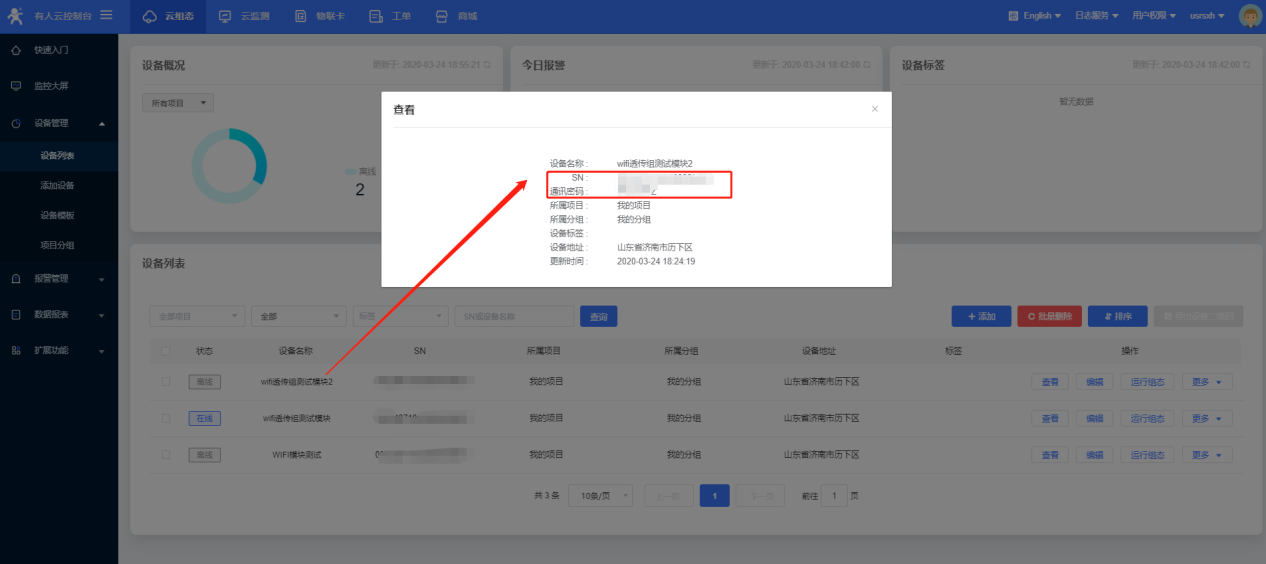 16、依據(jù)第11~15步,讓第二個(gè)wifi模塊入網(wǎng),第二個(gè)模塊的設(shè)備ID與通訊密碼填寫位透?jìng)髟颇K2的SN與密碼,配置完模塊重啟, 第二個(gè)模塊在云端顯示上線。