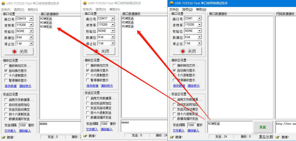 26、打開三個(gè)串口調(diào)試助手進(jìn)行數(shù)據(jù)通信測(cè)試,測(cè)試結(jié)果如下。其中模塊與電腦通過串口線直連所識(shí)別出來的串口號(hào)可以在設(shè)備管理器中查看。