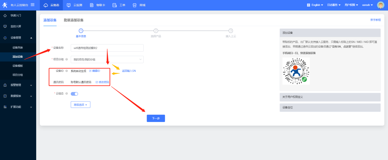 9、再次添加設(shè)備,名稱設(shè)置“wifi透?jìng)鹘M測(cè)試模塊”,設(shè)備ID與通信密碼自動(dòng)生成后點(diǎn)擊“下一步”后,選擇“數(shù)據(jù)透?jìng)鳌?,確認(rèn)添加。