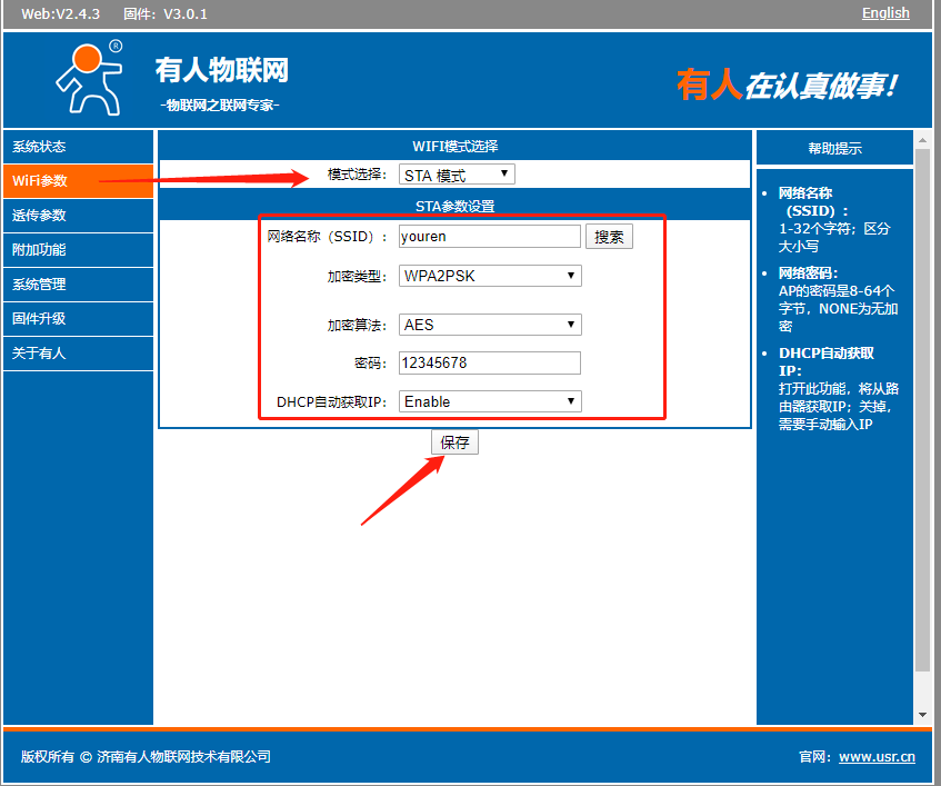 12、內(nèi)置網(wǎng)頁(yè)的賬號(hào)和密碼都是admin,進(jìn)入以后選擇模式選擇模式選擇為sta模式,設(shè)置要連接的wifi名稱、加密類型、算法、密碼,點(diǎn)擊保存;(先不要重啟,等設(shè)置完所有的參數(shù)再重啟設(shè)備)。