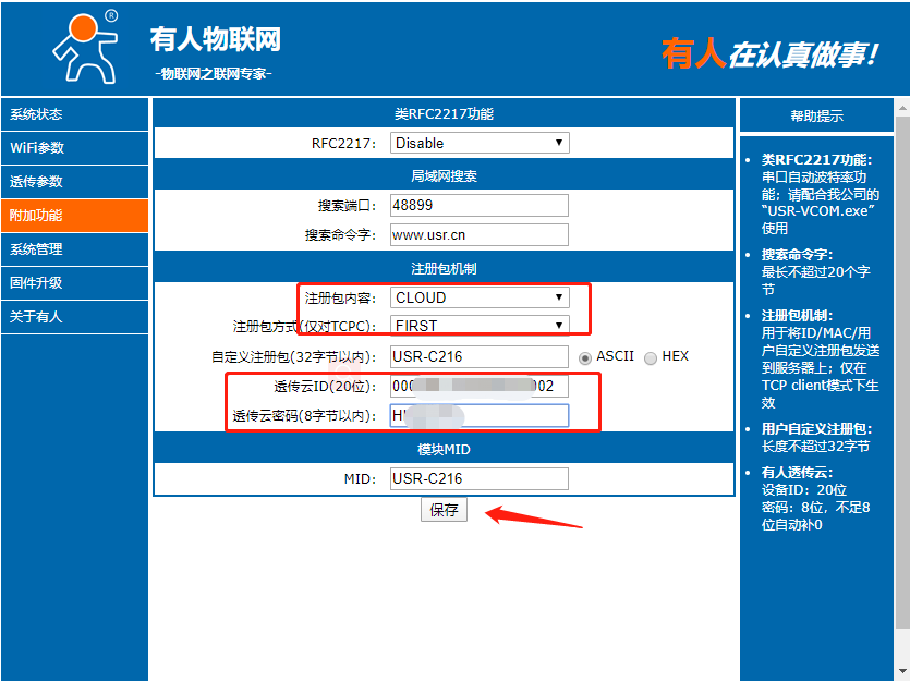 14、進(jìn)入附加功能,注冊(cè)包選擇透?jìng)髟疲钌贤競(jìng)髟粕闲陆⒌脑O(shè)備id,和密碼(如下圖所示),點(diǎn)擊保存。