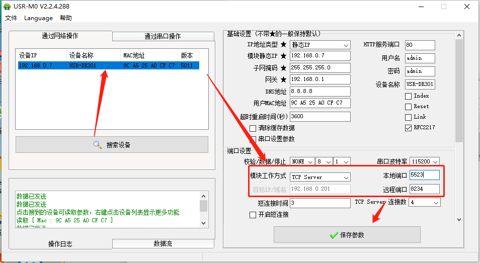 4、打開設(shè)置軟件,點擊“搜索設(shè)備”當(dāng)搜索列表中出現(xiàn)301的設(shè)備后,點擊搜索到的設(shè)備,模塊工作方式設(shè)為TCP SERVER,本地端口5523,點擊保存參數(shù)。