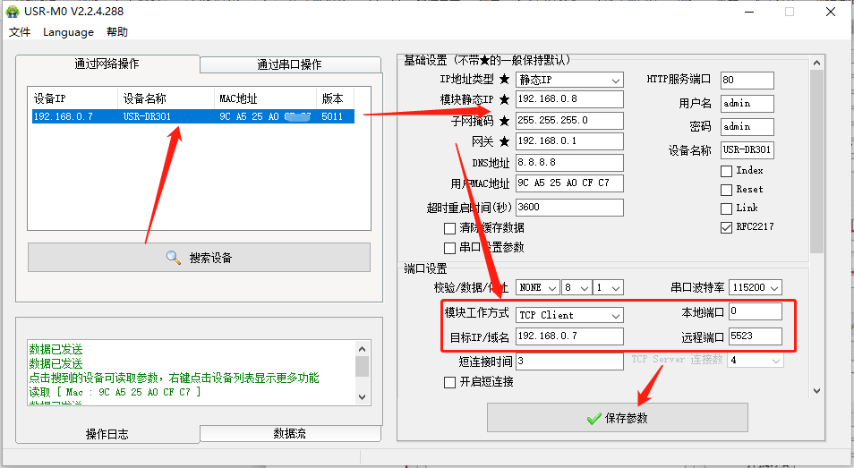 5、點擊“搜索設(shè)備”當(dāng)搜索列表中出現(xiàn)另一臺301的設(shè)備后,點擊搜索到的設(shè)備,為了防止Ip沖突,將此設(shè)備Ip修改為192.168.0.8,模塊工作方式設(shè)為TCp Client,本地端口0,遠程端口5523,點擊保存參數(shù)。
