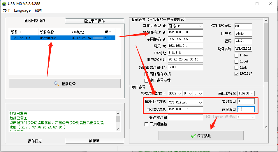 5、點擊“搜索設備”當搜索列表中出現(xiàn)另一臺302的設備后,點擊搜索到的設備,為了防止IP沖突,將此設備IP修改為192.168.0.8,模塊工作方式設為TCP Client,本地端口0,遠程端口15,點擊保存參數(shù)。