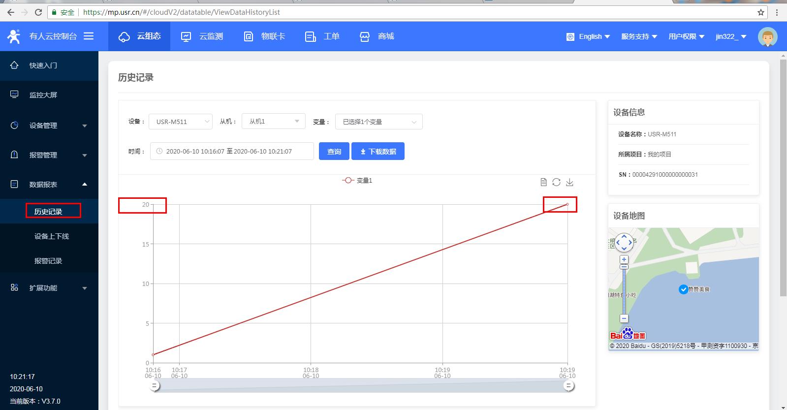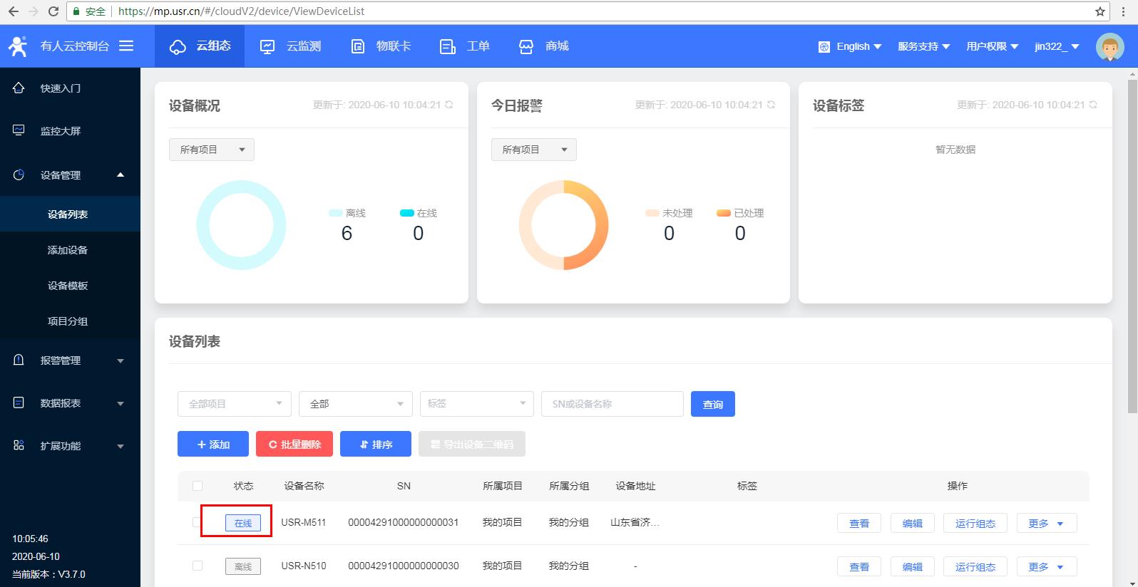 1、USR-M511網(wǎng)線接可以上網(wǎng)的路由器,M511參數(shù)設(shè)置完成,有人云設(shè)備會提示上線