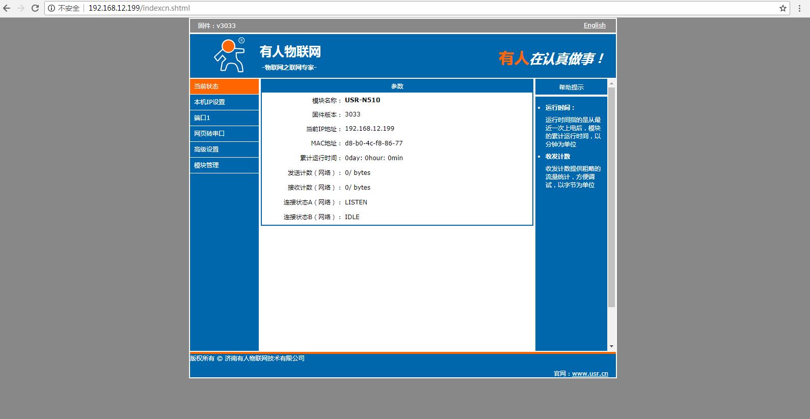 在瀏覽器輸入N510的IP,可以登錄N510的內(nèi)置網(wǎng)頁(yè)。工作方式TCP server 本地端口8899