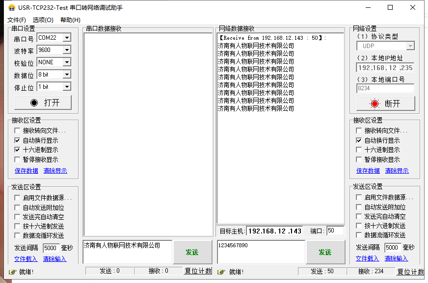 USR-TCP232-410S 工作方式UDP 目標(biāo)IP 255.255.255.255 遠(yuǎn)程端口8234 本地端口50