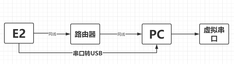 電腦串口——USB轉232串口服務器——網(wǎng)線——工業(yè)路由器——電腦(和以太網(wǎng)模塊E2同一網(wǎng)段)