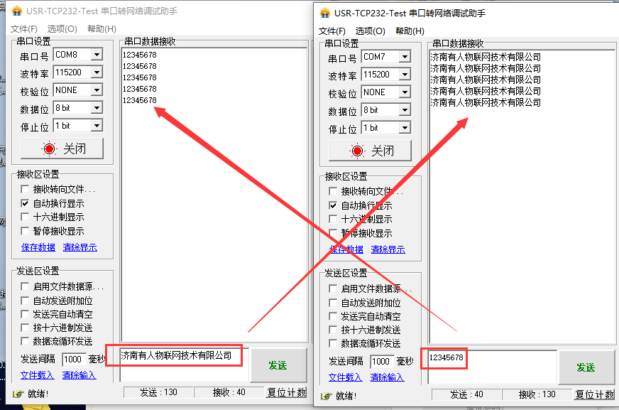 同時打開兩個串口轉網(wǎng)絡助手軟件。一個選擇虛擬串口,一個選擇COM7,即可進行收發(fā)測試