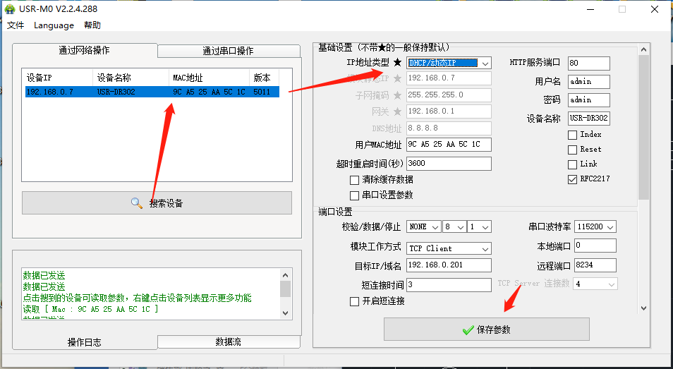 點擊“搜索設備”當搜索列表中出現(xiàn)302的設備后,單擊搜索到的設備,右邊基礎設置,在“Ip地址類型”將靜態(tài)Ip改為DHCp動態(tài)獲取,點擊保存參數(shù)。