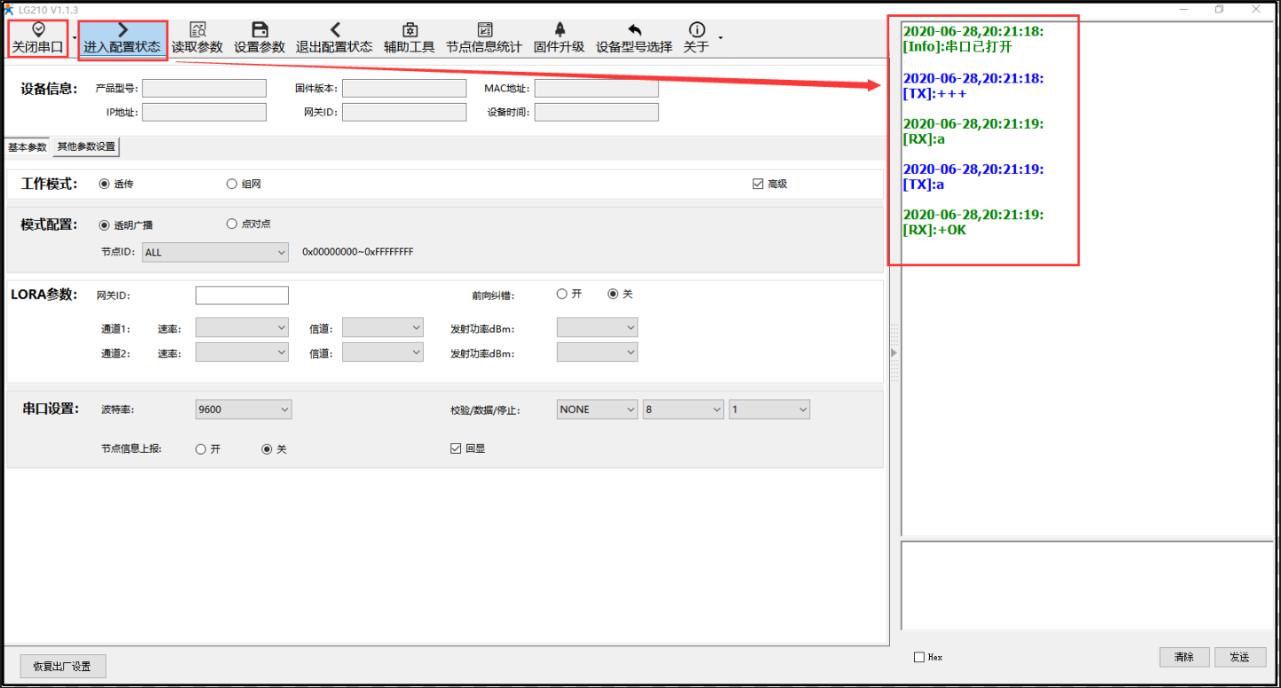 3) 點擊進入配置狀態(tài),能返回a +OK,說明模塊已進入配置模式,在配置模式下才可以讀取配置模塊參數, 若不返回a+ OK,說明模塊沒有進入配置模式,檢查接線是否可靠穩(wěn)定,打開的com口對不對,串口參數配置的對不對。