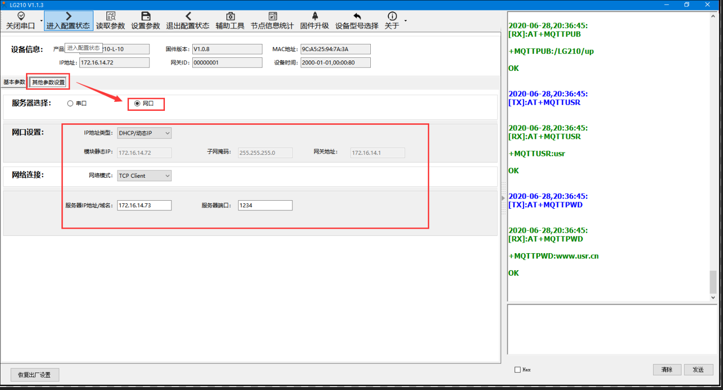 點擊“其他參數配置”,服務器選擇:“網口”。