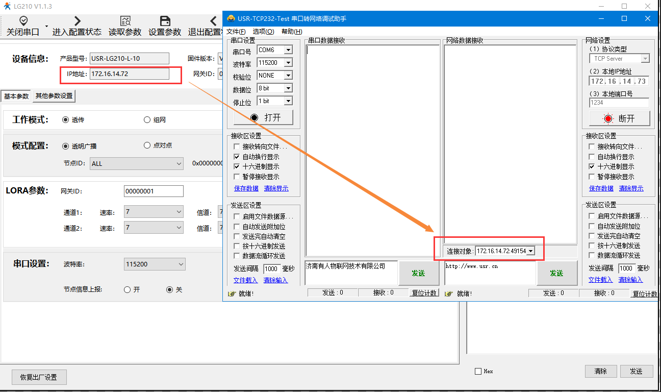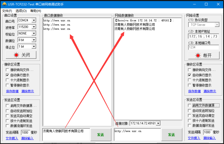 在USR-TCp232-Test軟件的串口端打開206的串口, 互發(fā)數據便可通信了。