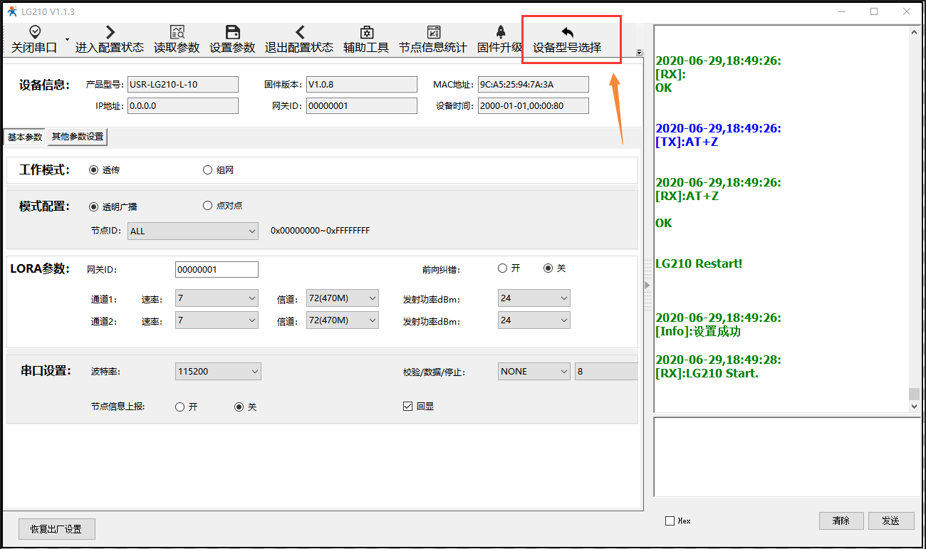 7) 配置LORA節(jié)點USR-LG206-L-C-H10,設置軟件設備選型選擇”LG206-L-p-H10”。