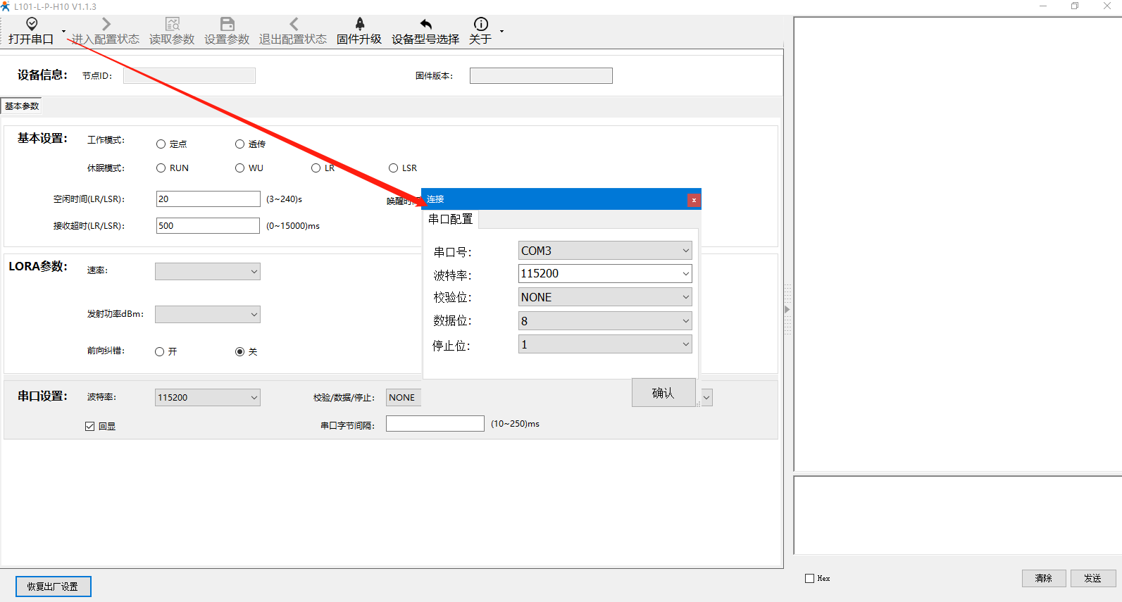 B、設(shè)置串口打開參數(shù),模塊默認串口參數(shù):115200,None,8,1,NFC。