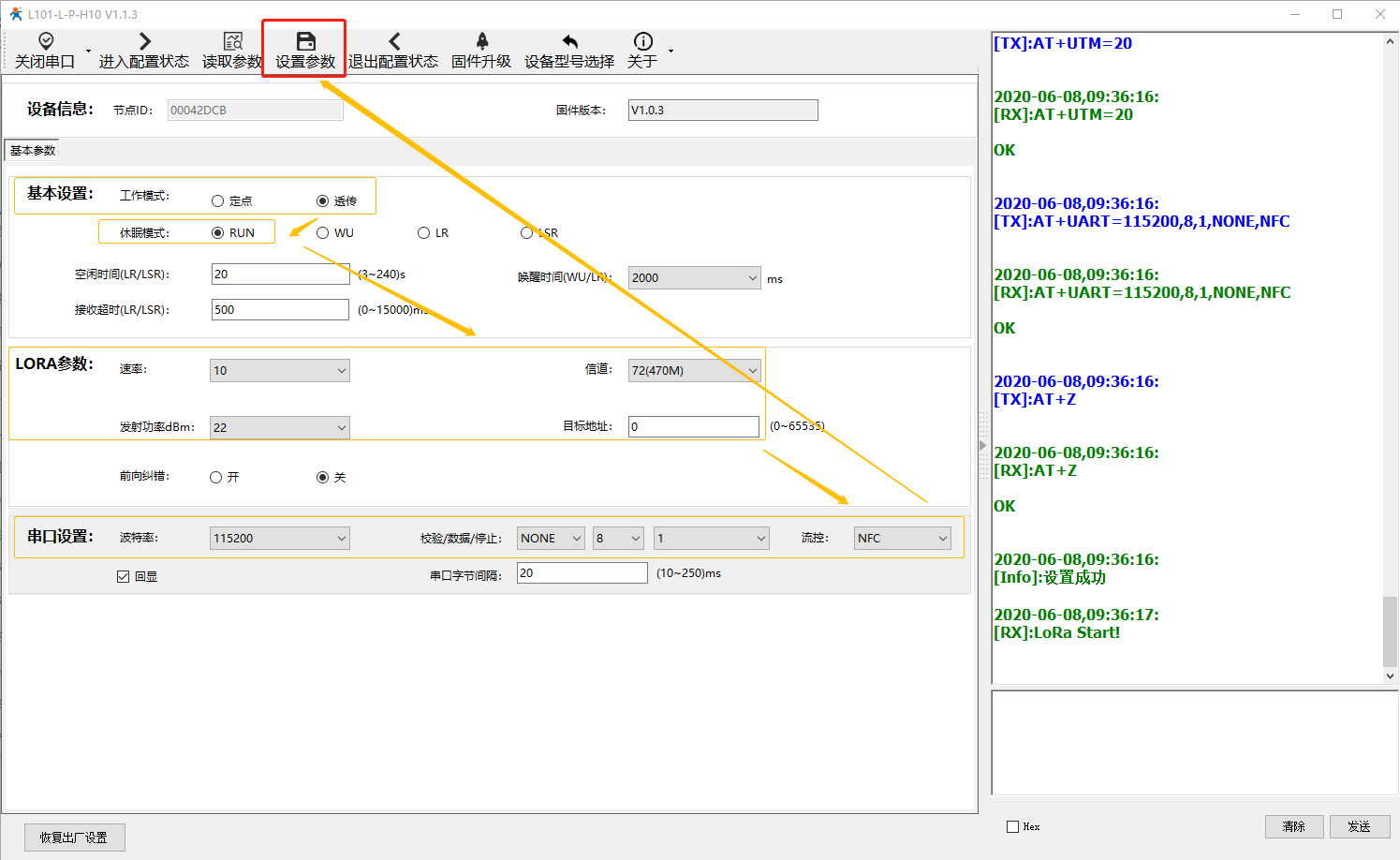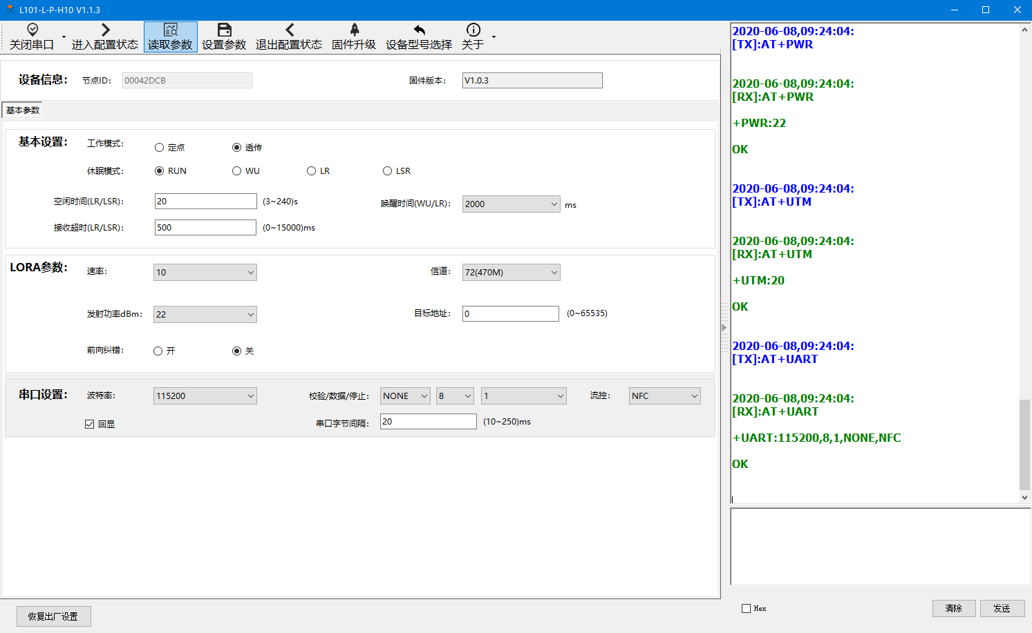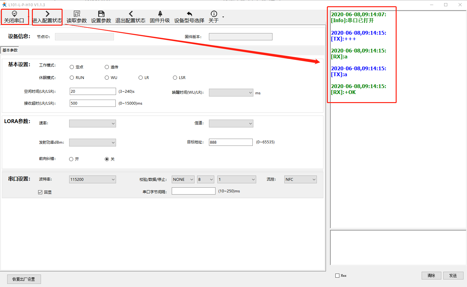A、打開LoRa設(shè)置軟件(產(chǎn)品型號選擇為L101-L-p-H10),依次點擊打開串口(選擇A、B對應(yīng)的串口號,串口參數(shù):115200,None,8,1,NFC)、進入配置狀態(tài)、讀取參數(shù)、配置上表中的參數(shù)、一鍵設(shè)置所有參數(shù),關(guān)閉LoRa設(shè)置軟件。
