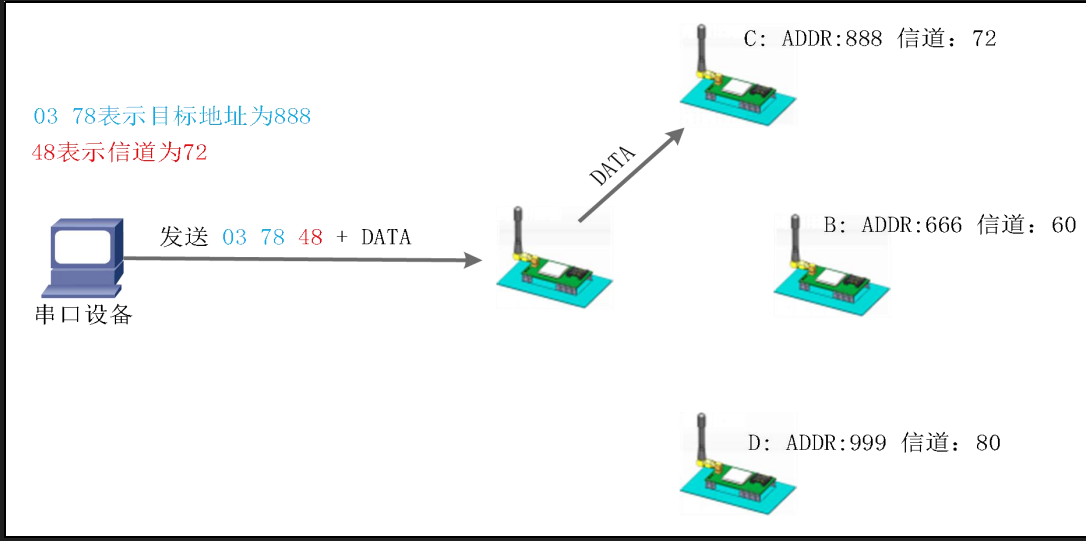 LoRa模塊定點(diǎn)模式可以在發(fā)送數(shù)據(jù)時(shí)靈活的改變目標(biāo)地址和信道從而實(shí)現(xiàn)靈活的改變目標(biāo)模塊。該模式在透明傳輸?shù)幕A(chǔ)上將發(fā)送數(shù)據(jù)的前 2 字節(jié)作為目標(biāo)地址(高位在前)第 3 字節(jié)作為信道,發(fā)射時(shí)模塊改變目標(biāo)地址和信道,發(fā)送后恢復(fù)原有設(shè)置。