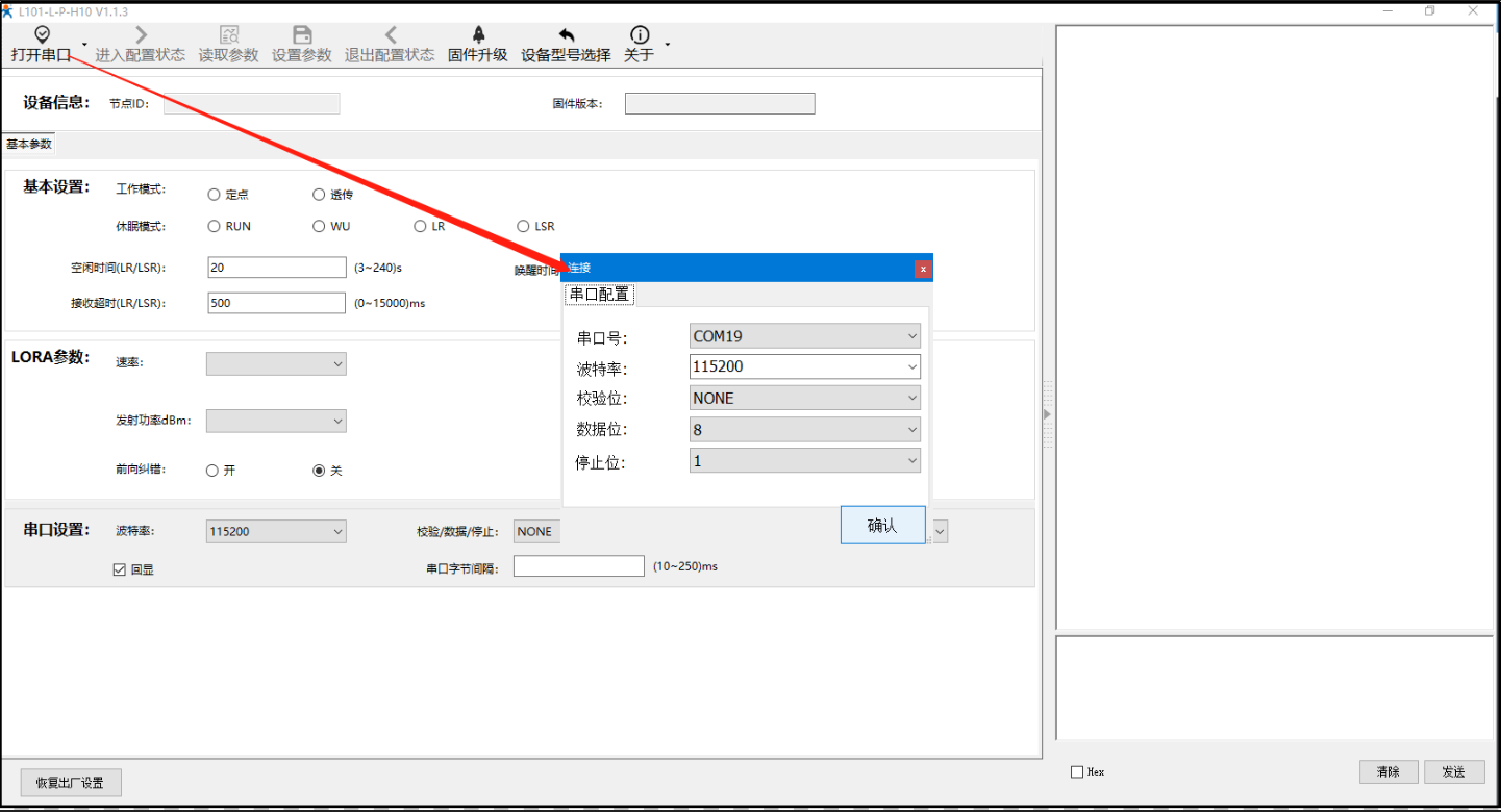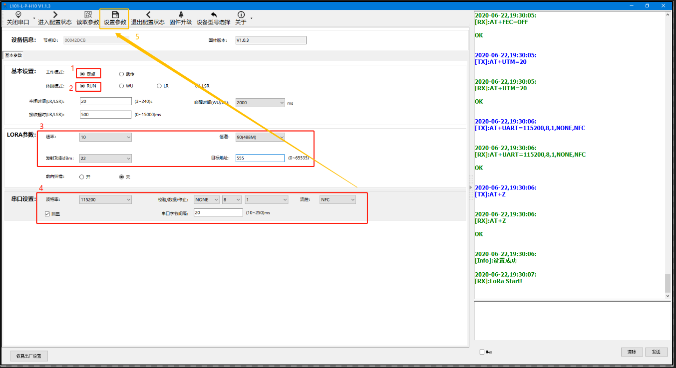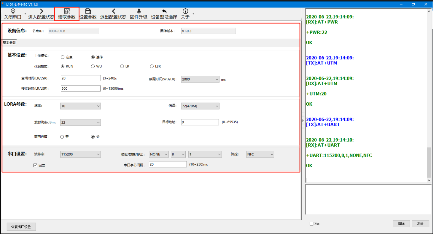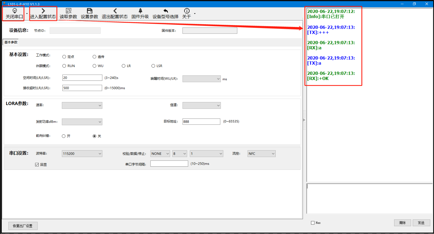 A、打開LoRa設(shè)置軟件(產(chǎn)品型號(hào)選擇為L101-L-p-H10),依次點(diǎn)擊打開串口(選擇A、B對應(yīng)的串口號(hào),串口參數(shù):115200,None,8,1,NFC)、進(jìn)入配置狀態(tài)、讀取參數(shù)、配置上表中的參數(shù)、一鍵設(shè)置所有參數(shù),關(guān)閉LoRa設(shè)置軟件。