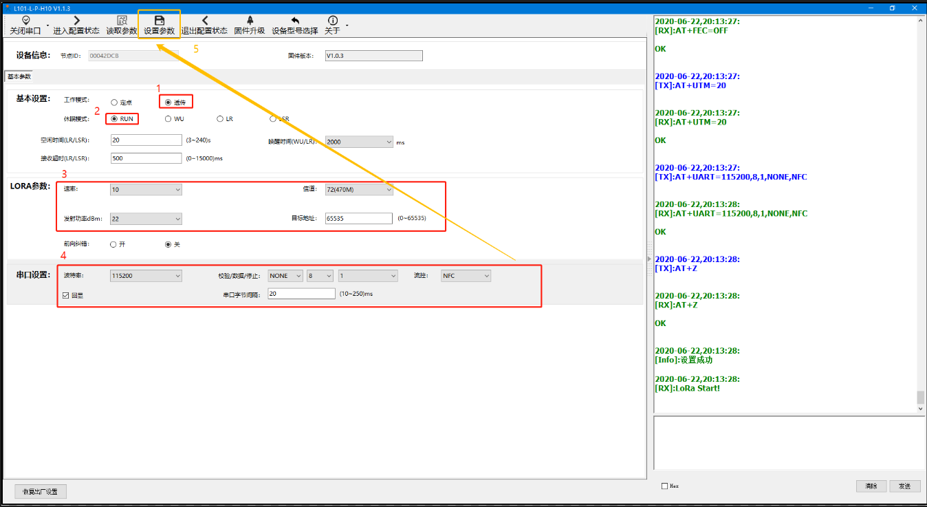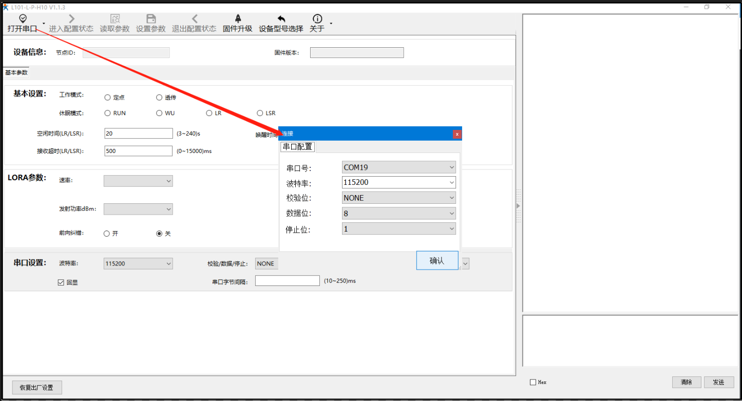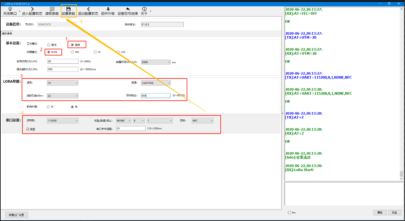 A、打開LoRa設(shè)置軟件(產(chǎn)品型號選擇為L101-L-p-H10),依次點(diǎn)擊打開串口(選擇A、B對應(yīng)的串口號,串口參數(shù):115200,None,8,1,NFC)、進(jìn)入配置狀態(tài)、讀取參數(shù)、配置上表中的參數(shù)、一鍵設(shè)置所有參數(shù),關(guān)閉LoRa設(shè)置軟件。