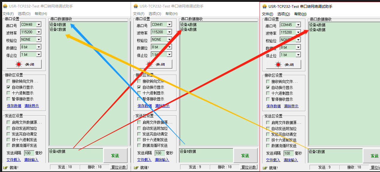 啟動三個USR-TCp232-Test(模擬串口設(shè)備1,2,3)分別連接LoRa數(shù)傳廣播端A、接收端B、C的串口,使用串口設(shè)備1發(fā)送數(shù)據(jù),串口設(shè)備2、3可接收數(shù)據(jù),設(shè)備2、3的數(shù)據(jù)可以發(fā)送給設(shè)備1,通信效果如下圖所示: