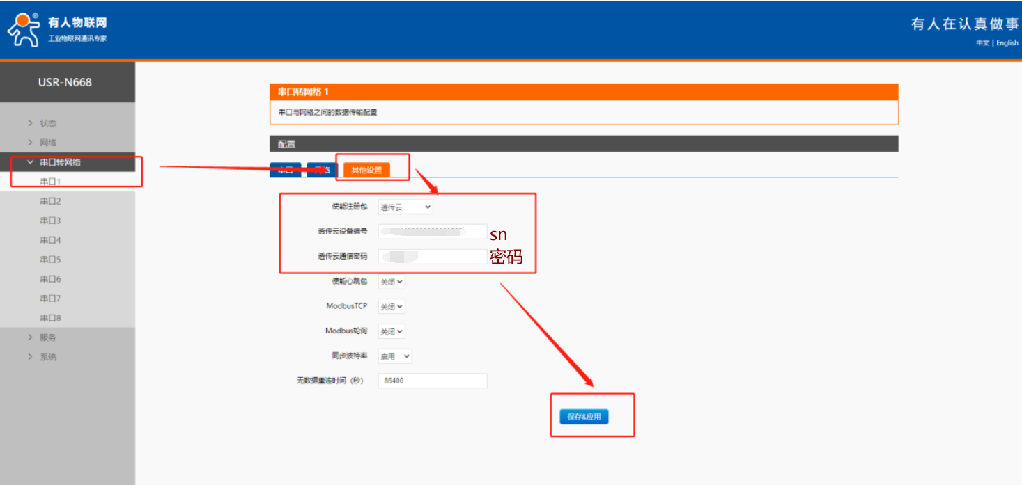 8.注冊包類型選擇透傳云,設(shè)備編號和密碼填寫為在云端添加設(shè)備生成的設(shè)備編號和密碼(SN與密碼可以通過操作按照圖示下面的案例獲取)(圖片中的為測試生成的,請?zhí)顚懽约旱脑O(shè)備編號和密碼)設(shè)置完成后點(diǎn)擊保存應(yīng)用。