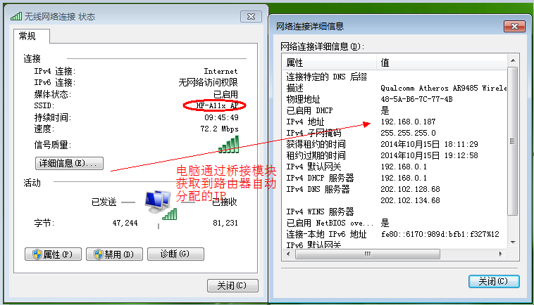 5:電腦連接WiFi模塊AP??梢垣@取到路由器網(wǎng)段的IP??梢耘c路由器內(nèi)局域網(wǎng)電腦或者網(wǎng)絡(luò)設(shè)置通信。