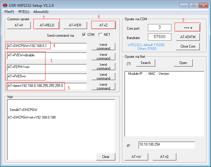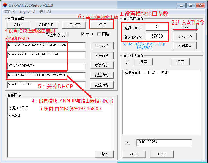 4:設(shè)置模塊的LANN口ip和路由器相同網(wǎng)段192.168.0.188 .AT+LANN